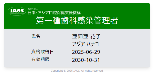 - 特定非営利活動日本・アジア口腔保健支援機構認定第二種(もしくは第一種)歯科感染管理者 山田花子