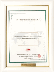 また、歯科感染管理者が在籍する認定医療機関向けに、A4サイズの額入りの「施設認定証」も発行しており、ご登録いただいた医院様は、一般の患者様向けのJAOS認定 歯科医院一覧ページでご紹介しています。