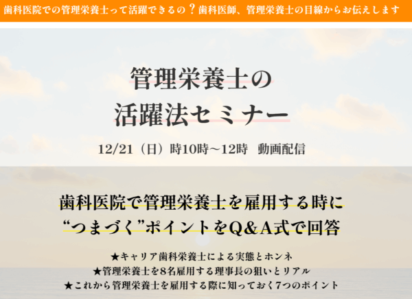 2025年09月25日 (木) オンライン 継続ポイント対象 臨床実践セミナー全7回シリーズ(第3回)/管理栄養士と歩むこれからの歯科医院「施設基準研修の内容を院内に落とし込む」ということを目的に、【臨床実践セミナー】(全7回)を開催します!